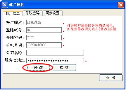 (5)帐户属性:当您已经建立好一个帐户以后,您还可以通过帐户属性修改该帐户的一些信息,这些信息包括您在建立该帐户时输入的信息包括(帐户昵称、登陆帐号、登陆密码、手机号码、公司名称、服务器地址)以及登陆帐号的密码和是否开启自动同步功能。修改帐户属性如下图:帐户->属性