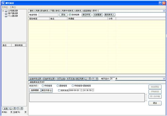 撰写短信窗口里主要的功能包括:添加接收人、添加短信内容、发送短信、保存短信。