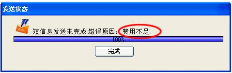 (4)发送短信:当短信内容不为空,接收人也不为空时,就可以点击[开始发送]发送短信。发送过程中会有一个进度显示框显示发送的进度,如果由于某中原因发送没有完成,进度显示框上会显示发送失败的原因,如下图: