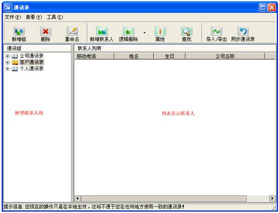 通讯录说明:在通讯录中有三个固定不可以删除的通讯录,分别是公司通讯录、客户通讯录、个人通讯录。用户可以在这三个通讯录中添加自己的联系人组,接着在联系人组中添加联系人。