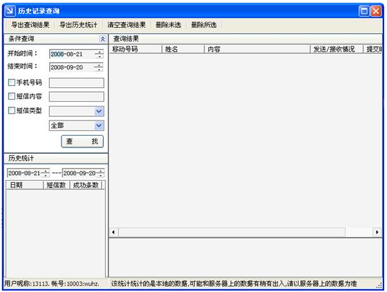 历史查询功能:该功能主要实现对短信发送记录的查询和发送成功数量的历史统计,以及对查询的短信息进行重发操作。