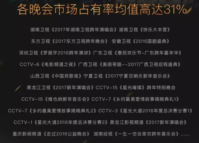 星广新春跨屏营销聚集众多新春晚会资源,第一场新春跨屏营销就包揽了包括湖南卫视、深圳卫视、东方卫视、安徽卫视等各大优秀卫视的跨年晚会,更有CCTV-6跨年节目“电影频道之夜”和CCTV-15的“乐迎新年—2016星光璀璨演唱会”。