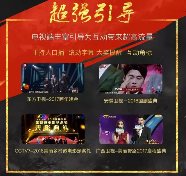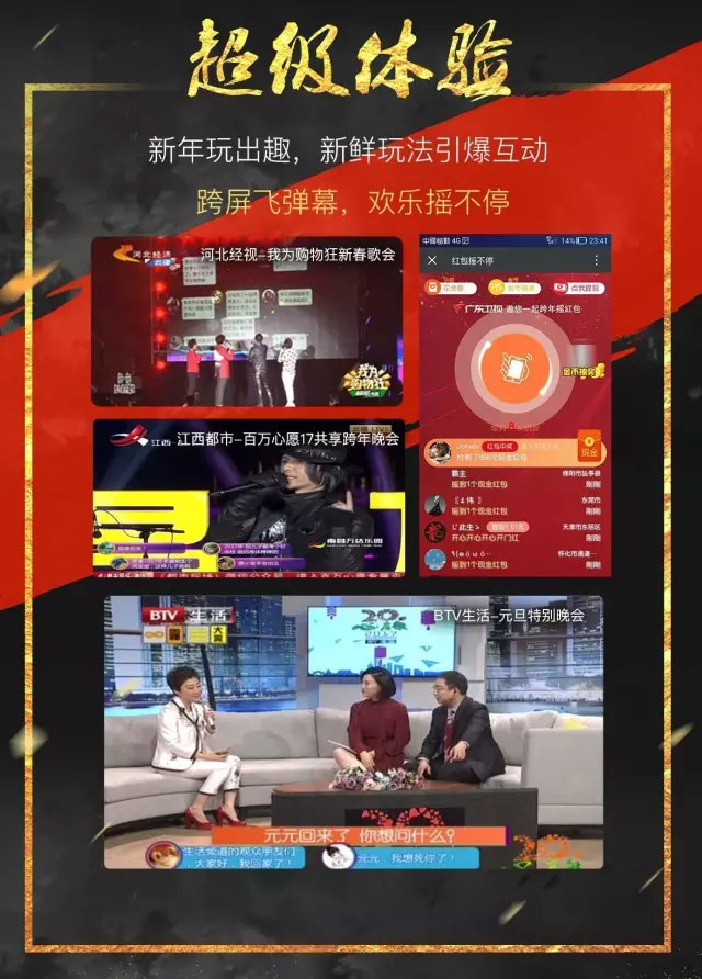 大屏电视端20+台跨年晚会,每台晚会几乎都会有主持人口播,压屏条、红包角标等多种形式吸引电视观众的注意力,引导电视观众参与跨屏互动。