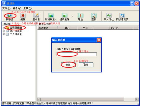 操作步骤:首先选定一个通讯录或通讯录中的一个联系人组,然后点击工具栏->新增组,弹出要求输入联系人组名称的输入框输入组名,点击[确定]即可。具体操作可见下图: