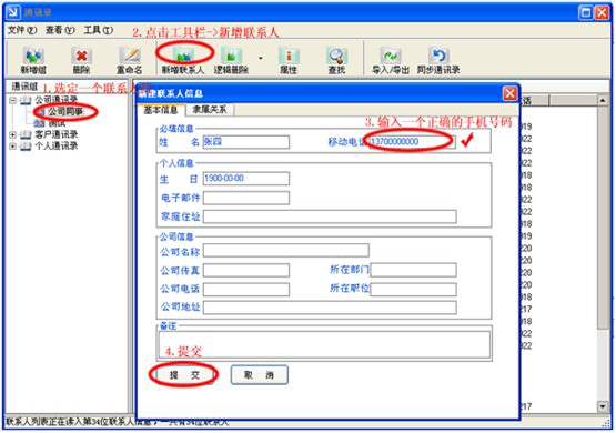 操作步骤:首先选定联系人列表中的一个联系人,然后点击工具栏->属性,弹出联系人信息,修改信息完成以后点击[提交]即可。