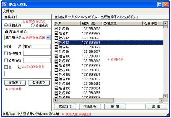 (3)查找联系人:可通过姓名、手机号码、公司名称、备注等信息在整个通讯录或是指定的通讯录中进行模糊或精确的联系人查找。