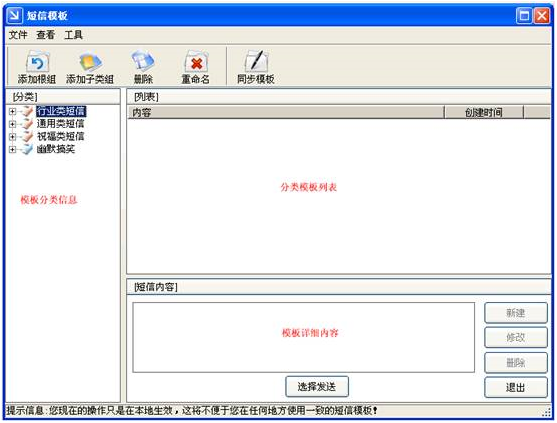1.新建:将”短信内容框“中的短信作为一条新的短信模板添加到指定的分类中。(注意:只能在个人分类中新建短信模板)