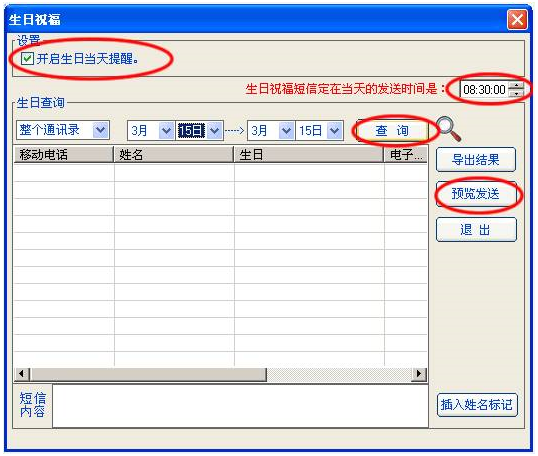 (3)查找/预览发送:要发送生日祝福短信首先需要按照指定日期进行[查找],如果查找有结果则可以根据该查找结果进行[预览发送],同时也可以[导出结果]以便进行其他处理。