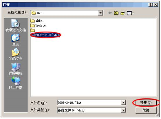 工具->恢复数据库(点击),弹出“打开”窗口,默认打开客户端程序所在路径,选择一个客户端的备份文件(*.~bat),点击打开即可。